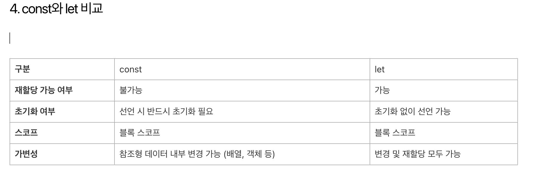 자바스크립트에서 const는 상수(Constant)를 선언하는 키워드입니다. 한 번 할당된 값은 재할당할 수 없으며, 값이 고정됩니다. 하지만, 객체나 배열처럼 참조형 데이터의 내부 값은 변경 가능합니다.1. 상수 선언의 주요 목적코드 안정성 및 예측 가능성 확보재할당 방지로 인한 의도치 않은 값 변경 방지의미 명확성 (변경되지 않는 값이라는 명시적 표현)2. 상수 선언의 장점1. 의도치 않은 값 변경 방지 const MAX_RETRIES = 5; MAX_RETRIES = 10; // Error! 재할당 불가MAX_RETRIES는 상수로 선언되어, 이후 변경을 방지합니다.2. 코드 가독성 향상상수로 선언할 때에는 const 로 선언 후, 변수를 대분자와 언더바로 표기합니다. 업계의 관행이며, 이를통해 다..
